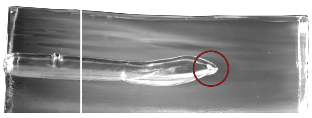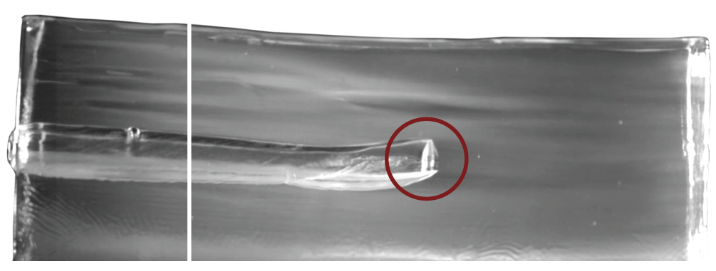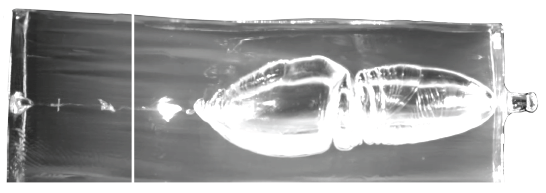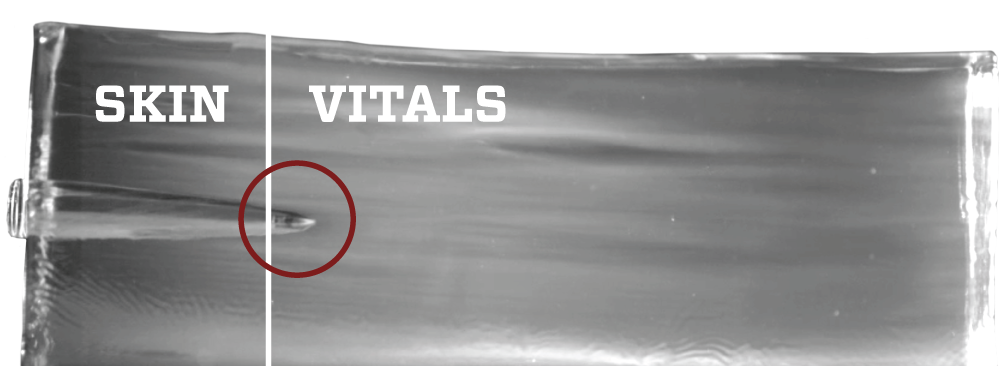 Once hitting the water-based tissue, the bullet begins to tumble.
